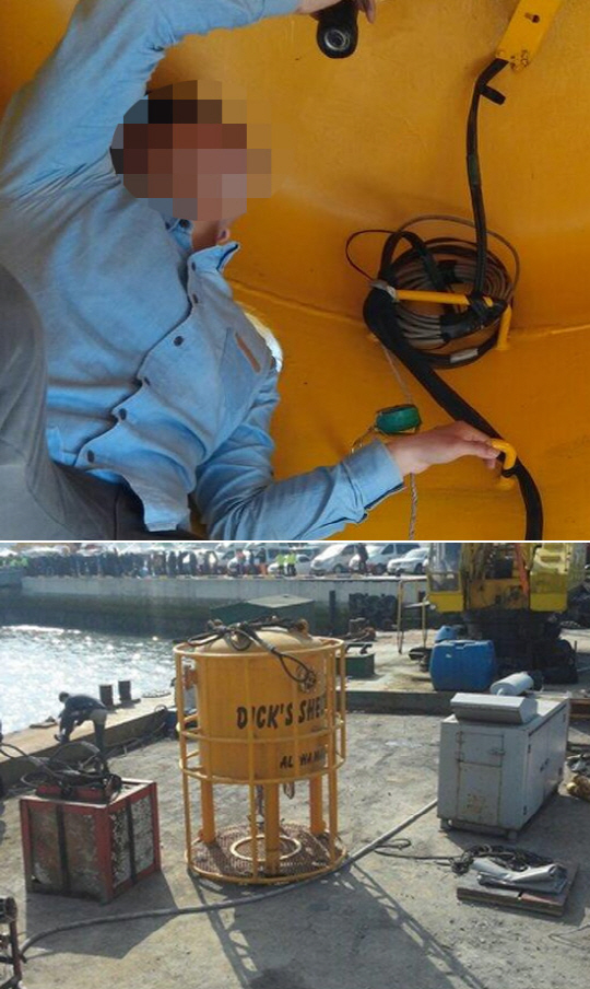 '다이빙벨'은 크레인에 매달아 물속으로 집어넣고 바닥까지 내려 엘리베이터 통로를 만드는 것이다.