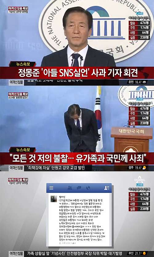 정몽준 사과에 네티즌들은 "정몽준 사과, 아들이 큰 일 해냈다", "정몽준 사과, 직접 아들도 사과해야 하지 않을까", "정몽준 사과, 미개한 국민이라 감히 투표도 못 하겠네", "정몽준 사과, 틀린말 맞는말을 떠나서 지금 온 국민이 비통한 상황에서 혼자 잘났다고 떠드는 건 미개한 짓이 아니란 말인가", "정몽준 사과, 중2 허세병도 아니고 뭐지"등의 반응을 보였다. <스포츠조선닷컴>