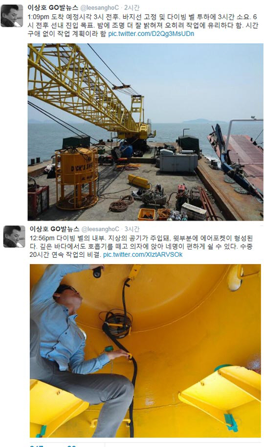 이어 "다이빙벨이 진도 해역에 오후 3시 전후를 기해 도착할 예정이다. 바지선 고정 및 다이빙벨 투하에 3시간이 소요돼 오후 6시경 선내 진입이 목표"라며 "밤에 조명 더 잘 밝혀져 오히려 작업에 유리하다 함. 시간구애 없이 작업 계획이라 함"이라며 다이빙벨이 당국과 협조 하에 투하될 것이라고 밝혔다.