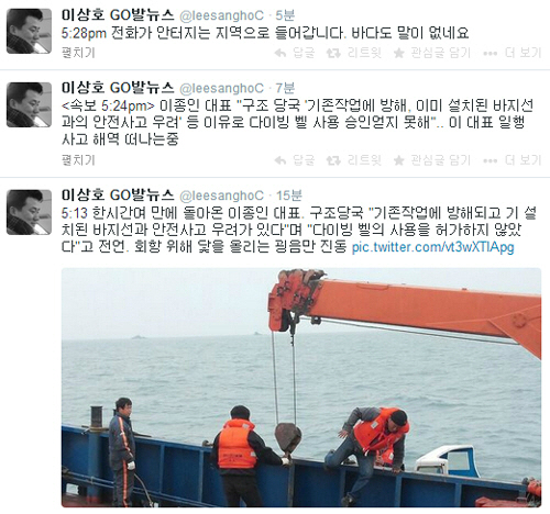 앞서 이상호 기자는 "도착 예정시각 3시 전후. 바지선 고정 및 다이빙 벨 투하에 3시간 소요. 6시 전후 선내 진입 목표"라며 해난 구조 전문가 알파잠수 이종인 대표가 개발한 다이빙벨 투입이 임박한 것으로 전해 많은 이들의 기대감을 높였다.