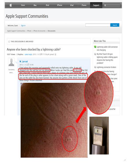 애플코리아(이하 애플)가 라이트닝 케이블 단자로 인한 화상사고가 이어지는데도 안일하게 대처해 비난을 사고 있다.