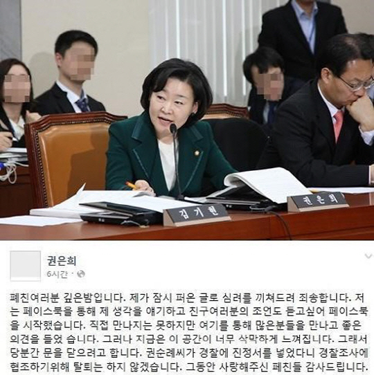 이후 권 의원은 사과문을 게재하며 "제가 잠시 퍼온 글로 심려를 끼쳐드려 죄송하다. 직접 만나지는 못하지만 여기(페이스북)를 통해 많은 분들을 만나고 좋은 의견을 들었다"며 "지금은 이 공간이 너무 삭막하게 느껴진다. 당분간 닫으려고 한다. 경찰조사에 협조하기 위해 탈퇴는 하지 않겠다"고 밝혔다. 해당 글과 동영상은 삭제된 상태다.