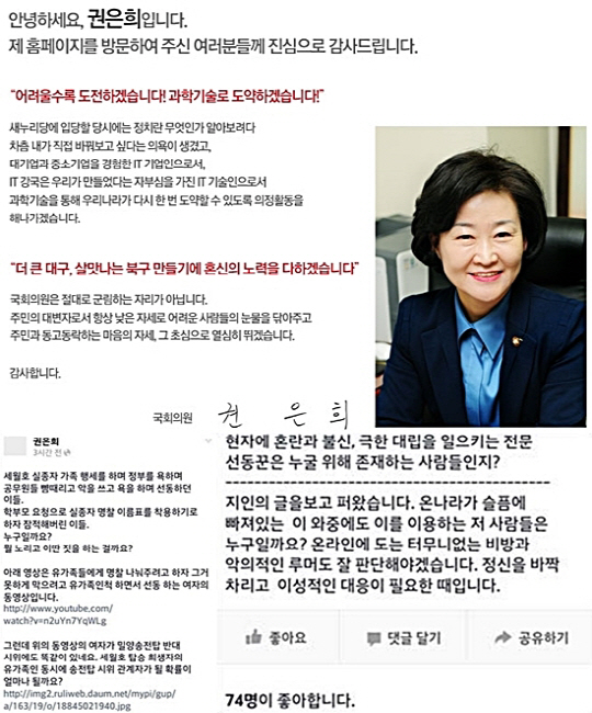 이후 권은희 의원은 사과문에서 "제가 잠시 퍼온 글로 심려를 끼쳐드려 죄송하다. 직접 만나지는 못하지만 여기(페이스북)를 통해 많은 분들을 만나고 좋은 의견을 들었다"며 "지금은 이 공간이 너무 삭막하게 느껴진다. 당분간 닫으려고 한다. 경찰조사에 협조하기 위해 탈퇴는 하지 않겠다"고 전했다.