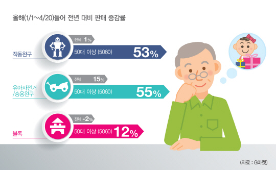 품목별로 보면 고가의 장난감일수록 5060세대의 구매량 증가폭이 두드러졌다. 가격이 5만~8만원대로 상대적으로 고가에 속하는 작동완구의 경우 50세 이상 고객의 구매량이 53% 급증했다.