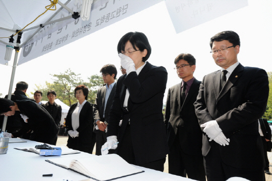 이정희 대표는 23일 오후 경기도 안산 올림픽기념관 임시 합동분향소를 찾아 세월호 침몰 희생자들을 향해 헌화했다.