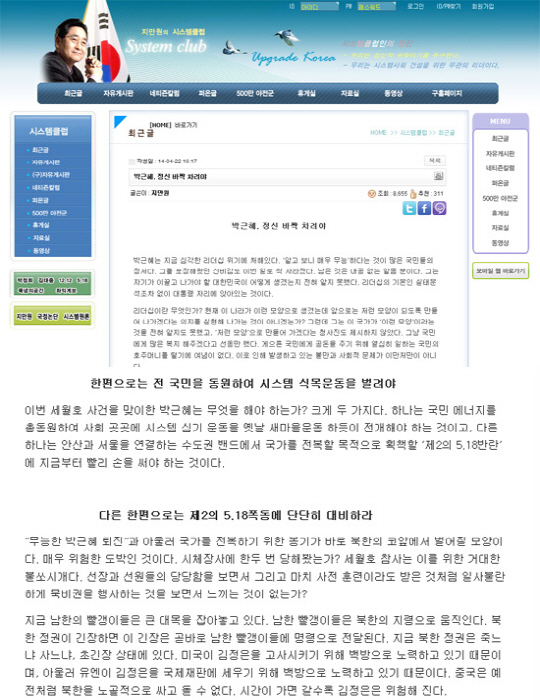 특히 '다른 한편으로는 제2의 5.18폭동에 단단히 대비하라'는 소제목의 글 내용에는 "무능한 박근혜 퇴진과 아울러 국가를 전복하기 위한 봉기가 바로 북한의 코앞에서 벌어질 모양이다. 매우 위험한 도박인 것이다. 시체장사에 한두 번 당해봤는가? 세월호 참사는 이를 위한 거대한 불쏘시개다. 선장과 선원들의 당당함을 보면서 그리고 마치 사전 훈련이라도 받은 것처럼 일사불란하게 묵비권을 행사하는 것을 보면서 느끼는 것이 없는가?"라며 강렬 비판했다.
