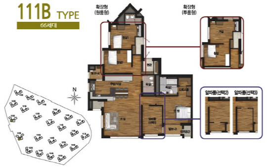 최근 소형평수의 계약을 완료하고, 나머지 잔여세대 111㎡(구 43평형) 분양을 진행 중이다. 이 중 111㎡가 부분임대형이다. 이 아파트는 평면을 4베이구조로 채광을 확보하였으며, 알파룸을 제공해 침실 또는 다른 공간으로 사용 가능하다.