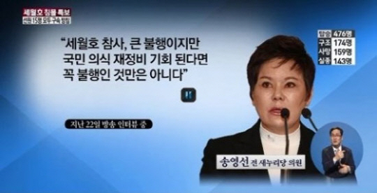 송 전 의원은 지난 22일 JTBC 뉴스특보 7부 '전용우의 시사집중'에 출연해 세월호 침몰 사고에 대해 언급했다.