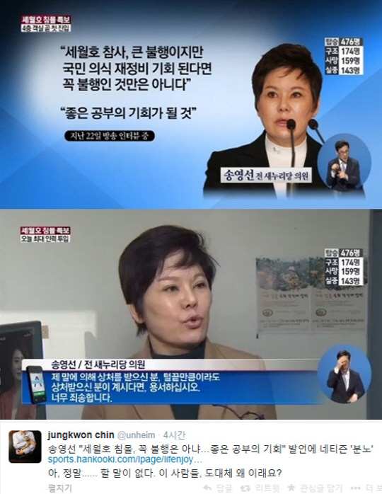 특히 송 전 의원은 "그런데 근본적인 변화는 없었다. 이번 기회가 너무나 큰 불행이지만 우리를 재정비할 수 있는, 국민의식부터 재정비할 수 있는 기회가 된다면 꼭 불행인 것만은 아니다"며 "좋은 공부의 기회가 될 것이다"고 막말을 내뱉었다.