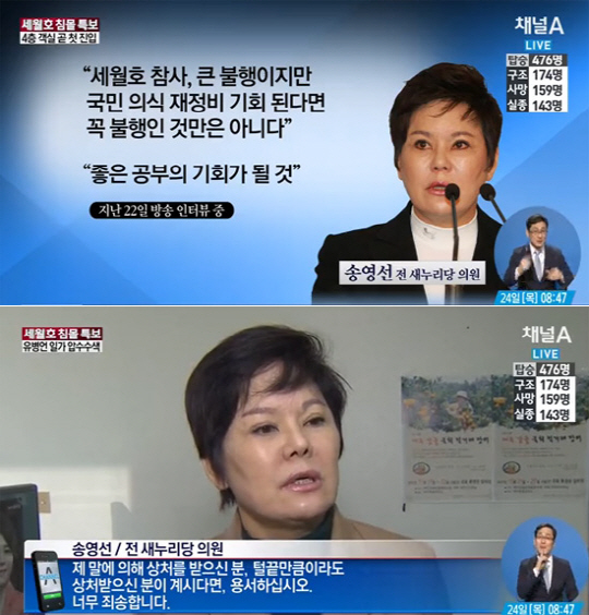 앞서 송 전 의원은 JTBC 뉴스특보 7부 '전용우의 시사집중'에 출연해 세월호 침몰 사고에 대해 "너무나 큰 불행이지만 국민의 의식부터 재정비할 수 있는 기회가 된다면 꼭 불행인 것만은 아니다"라며 "좋은 공부의 기회가 될 것"이라고 주장했다.