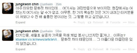 이어 진중권은 "아주 미묘한 문화적 차이인데… 여기서는 과민반응으로 보이지만, 현장에서는 어땠는지 여기서는 알 수가 없죠"라며 "아무튼, 한 가지 확실한 것은 거기 내려간 터키 분들이 저보다 수 천 배 훌륭한 분이라는 것. 그 말을 하고 싶었습니다"라며 자원봉사로 타국에 선행을 실천한 터키인들에 고마운 마음을 드러냈다.