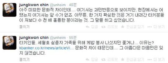 이어 "아주 미묘한 문화적 차이인데 여기서는 과민반응으로 보이지만, 현장에서는 어땠는지 여기서는 알 수가 없다. 아무튼, 한 가지 확실한 것은 거기 내려간 터키 분들이 저보다 수 천 배 훌륭한 분이라는 것. 그 말을 하고 싶었다"고 의견을 덧붙였다.