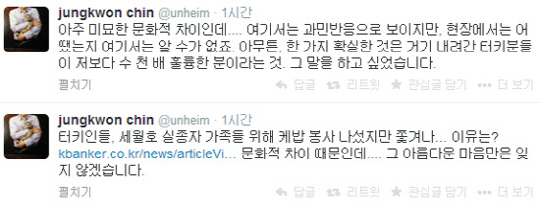 이어 진중권은 "미묘한 문화적 차이다. (인터넷 매체 등)여기서는 과민반응으로 보이지만 현장에서는 (상황이)어땠는지 알 수가 없다. 한 가지 확실한 것은 거기 내려간 터키분들이 나보다 수 천 배 훌륭한 분들이라는 것. 그 말을 하고 싶다"고 덧붙였다.