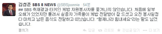 이날 오후 SBS 김성준 앵커는 자신의 트위터를 통해 "SBS 취재결과 터키인 케밥 자원봉사자들 쫓겨나지 않았다. 처음에 일부 오해가 있었지만 풀려서 실종자 가족들이 케밥을 전달받아 잘 드셨고 오전 봉사일정 다 마치고 남은 음식도 전달하고 떠났다. '형제나라 힘내세요'라는 말도 남겼다"는 내용을 게재했다.