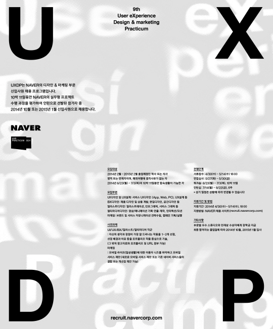 네이버㈜(대표이사 사장 김상헌)는 웹 디자인, 마케팅 분야 인력 양성을 위한 UXDP (User eXperience Design&marketing Practicum)의 9번째 워크샵 참가자 접수에 앞서, 네이버 기업홈페이지(navercorp.com)와 UXDP 공식 블로그(blog.naver.com/uxdp)에 사전과제를 공개했다고 밝혔다.