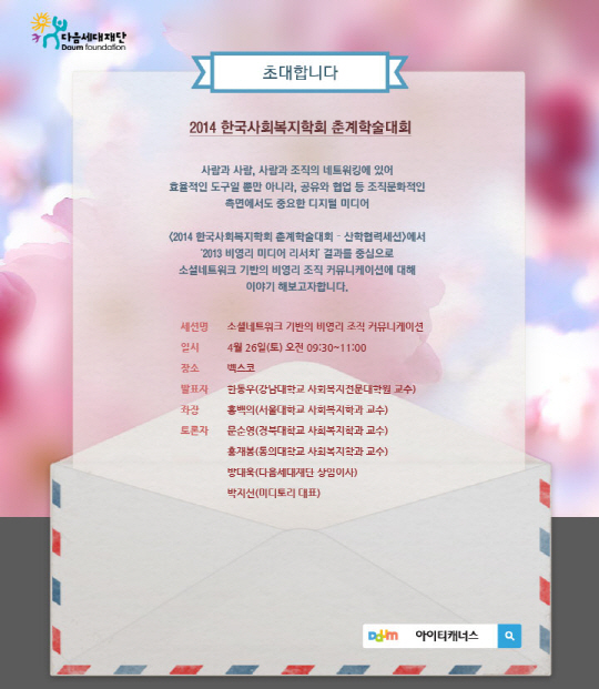 다음세대재단(www.daumfoundation.org)이 오는 4월 26일(토)에 부산 벡스코에서 진행되는 2014 한국사회복지학회 춘계학술대회 산학협력세션을 개최한다고 밝혔다. 춘계학술대회는 매년 봄 정기 개최되는 대회로서 평균 1,000명 이상의 참가자와 평균 200편 이상의 논문 발표가 이루어지고 있다.