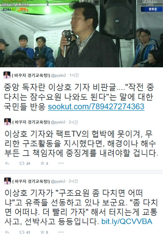 이어 "이상호 기자가 '구조요원 좀 다치면 어떠냐'고 유족들 선동하고 있나 보다. '좀 다치면 어떠냐. 더 빨리 가자' 해서 터지는 게 교통사고, 선박사고 등등이다"고 밝혔다.