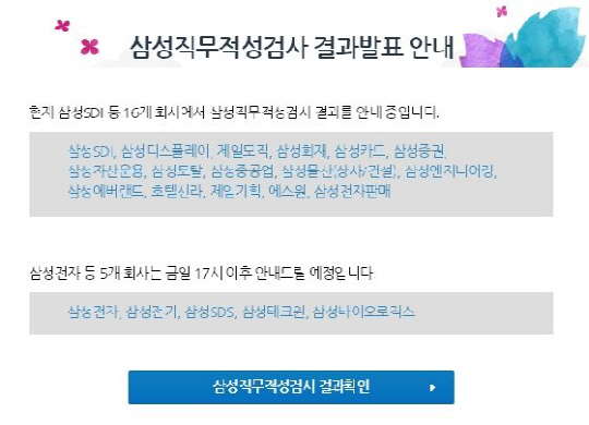 오후 2시에는 삼성SDI와 삼성디스플레이, 삼성증권, 삼성카드, 호텔신라, 삼성에버랜드 등 16개 계열사의 합격자를 발표한다. 이어 오후 5시에는 삼성전자, 삼성전기, 삼성테크원, 삼성바이오로직스, 삼성SDS 5개 계열사의 합격자를 발표할 예정이다.