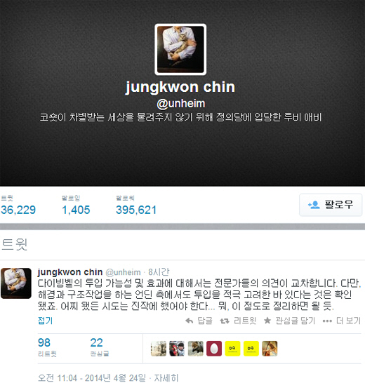 앞서 그는 "언딘 다이빙벨 관련해 참고하세요"라며 '민간 다이빙벨 거부 아니라 수긍 후 돌아간 것'이라는 링크를 게재했다.