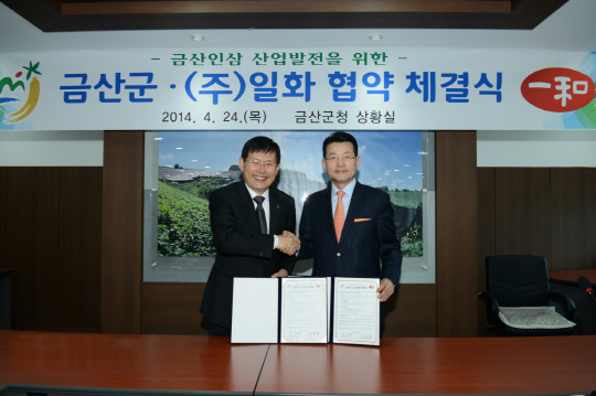 일화의 이성균 대표(오른쪽)와 박동철 금산군수(왼쪽)가 충북 금산군과 금산인삼 산업 발전을 위한 양해각서를 체결했다. 사진제공=일화