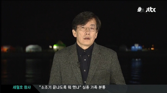 진도 팽목항에 선 손석희는 "시청자 여러분, JTBC '뉴스9'의 손석희입니다. 진도군 팽목항에 와있습니다"고 오프닝 멘트를 했다.