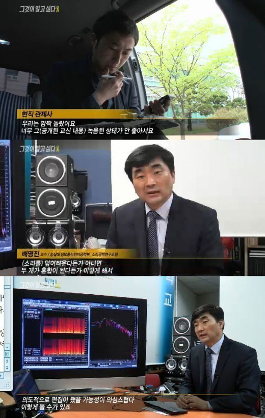 소리공학 연구소장인 배명진 교수 역시 교신 내용을 분석한 것과 관련 "뒤에 나오는 소리가 울림이 없이 정상적으로 제대로 나올수가 없다. (소리를) 덮어씌운다든가 아니면 두 개가 혼합이 된다든가 이렇게 해서 의도적으로 편집이 됐을 가능성이 의심스럽다 이렇게 볼수가 있죠"라며 교신에 대한 조작 가능성을 언급했다.