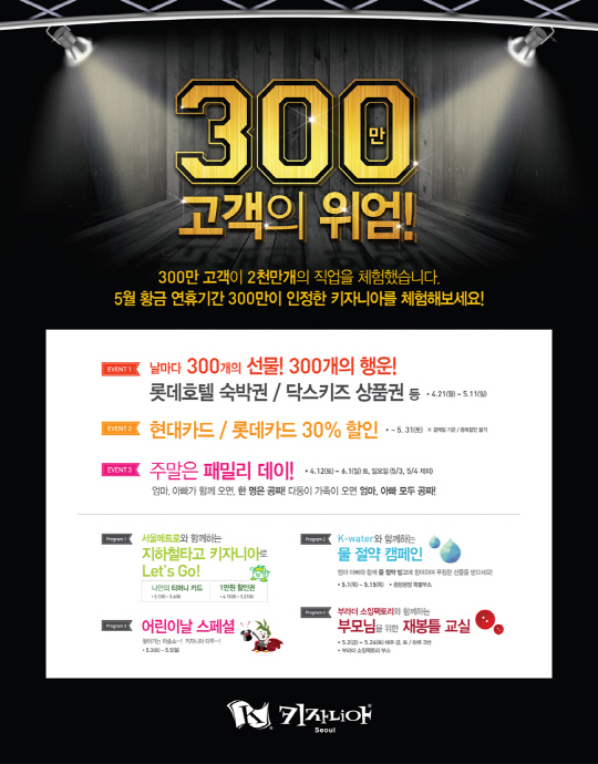 한편, 지난 25일 누적 방문객수 300만 명을 돌파한 키자니아 서울은 300만 고객 돌파 기념 '300개의 선물! 300개의 행운'이벤트도 다음 달 11일까지 진행한다. 키자니아 서울은 이벤트 기간 동안 방문하는 모든 고객에게 행운권을 지급하고, 추첨을 통해 롯데 호텔 숙박권, 우드플레잉 가구 교환권, 닥스 키즈 상품권 등 푸짐한 선물을 경품으로 제공할 계획이다. 키자니아 서울의 이벤트와 할인 혜택에 대한 자세한 사항은 키자니아 홈페이지(www.kidzania.co.kr) 또는 콜센터(1544-5110)에서 확인할 수 있다.