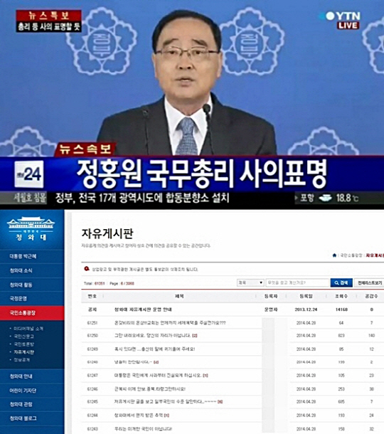 청와대 자유게시판 국민 불만 폭주…정홍원 총리 사고 수습 후 사표 수리