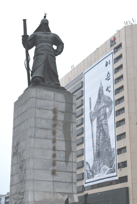 한국 홍보 전문가 서경덕 성신여대 교수가 기획하고 패션 디자이너 이상봉이 디자인한 '대한민국 영웅 프로젝트' 제2탄 '성웅 이순신' 대형 걸개그림이 28일 충무공탄신일을 맞아 27일 광화문 KT건물에 걸린 것.