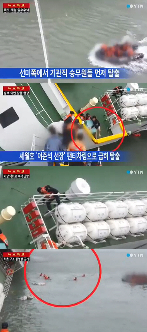해경 한 명이 배에 있는 구명정을 계속 발로 차며 펴보려고 하는 상황에서도 승무원 중 그 누구도 구명정은 신경도 안 쓰고 탈출하기에 바빴다. 또 승무원들이 배를 타고 탈출을 시도하는 상황에서 위기를 직감한 일부 승객들이 바다로 뛰어드는 모습도 화면에 포착됐다.