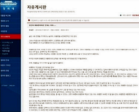 28일 오전 10시30분께 청와대 홈페이지 국민소통광장의 자유게시판이 세월호 사고 후 빠르게 대응하지 못한 정부 시스템을 질타하는 게시물이 쏟아졌다.