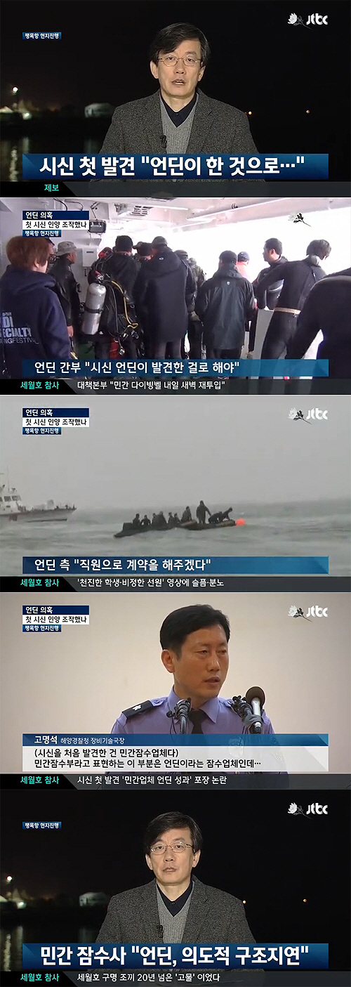 그러나 오전 7시경 언딘의 고위간부가 해경 지휘함에서 민간잠수부들의 배로 건너와 "시신을 언딘이 발견한 것으로 해야한다"며 "지금 시신을 인양하면 안 된다"고 했다는 것. 또한 "이대로 시신이 인양되면 윗선에서 다칠 분들이 너무 많다고 했다"고 민간잠수부는 주장했다.