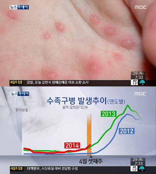 지난 28일 질병관리본부에 따르면 지난 1월부터 전국 100개소 의료기관을 대상으로 수족구병 표본감시를 진행한 결과, 제16주(4월 13일∼4월 9일)에 전체 외래환자 수 1천 명당 수족구병의사환자(의심환자)수가 3.9명까지 증가했다.