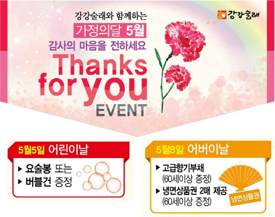 외식문화기업 강강술래가 5월 가정의 달과 황금연휴를 맞아 매장을 찾은 가족단위 고객을 대상으로 선물 증정 행사를 펼친다.