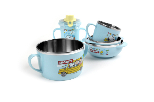 스누피 스텐 유아식기는 화사한 하늘빛 색상에 스누피와 친구들의 캐릭터가 앙증맞게 그려져 있는 캐릭터 식기로 친근한 캐릭터 이미지를 통해 재미는 물론, 스테인리스 소재를 사용해 안전성까지 겸비한 제품. 공기/대접에서부터 컵, 물통, 수저, 포크까지 갖춰져 있어 아이들의 즐거운 식사 시간을 책임진다. 특히 식기 내부는 스테인리스 스틸 소재로 냄새배임 걱정이 없고, 뜨거운 음식을 담을 때도 안심이다. 외부는 플라스틱 소재로 감싼 이중 구조를 채택해 내용물의 열이 밖으로 잘 전달되지 않아 뜨거운 그릇 때문에 아이가 다칠 염려가 없다.
