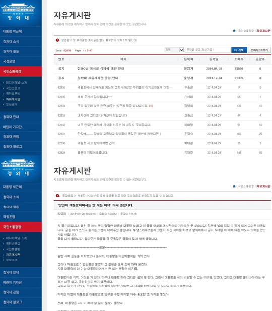이어 그는 "글은 제가 썼으나 용기는 그분이 내어주신 셈입니다. 부담스러우셨는지 그분이 자진 삭제를 하셨고 청와대에서 글이 삭제된 데 대해 다른 의도나 오해는 없으시길 바랍니다. 글을 다시 올립니다. 달아주신 답글들 중 주옥같은 글들이 많아 함께 올립니다"라고 남겼다. 이 글은 세월호 참사와 관련해 사고 이후 정부 대처의 미흡함을 지적하는 내용을 담아 네티즌들의 관심을 모았다. 앞서 27일 오전 정모씨가 청와대 자유게시판에 올린 '당신이 대통령이어선 안되는 이유'라는 글은 누리꾼들의 관심을 모으며 조회수 50만건을 돌파했다.