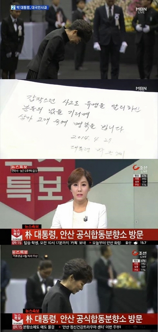 박근혜 대통령 합동분향소 조문, 삼가 고인의 명복을 빕니다", "