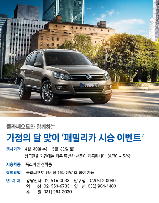 폭스바겐코리아 공식딜러 클라쎄오토가 5월 31일까지 한 달동안 서울과 경기도 클라쎄오토 5개 전시장에서 '패밀리카 시승 이벤트'를 진행한다.
