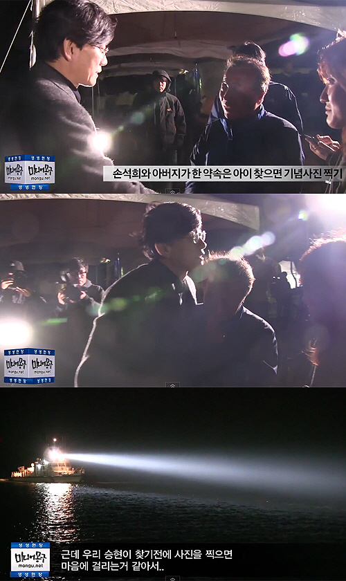 30일 미디어몽구 블로그에는 "어젯밤 세월호 현장에서 뉴스를 진행하던 손석희 앵커. 뉴스가 끝난 후 실종자 가족인 단원고 이승현 군 아버지와 한 약속이 있습니다. 그 약속이 꼭 지켜지길 바라는 간절함으로 영상을 올립니다"라는 글과 함께 영상이 게재됐다.