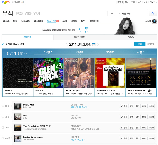 한편, 다음 뮤직서비스의 '방금그곡' 섹션에서는 TV BGM 목록과 140여개 라디오 프로그램의 선곡표를 확인하는 것도 가능하다. 방송 날짜·프로그램·채널·장르 등 다양한 조건에 따라 음악 목록을 검색할 수도 있다. [소비자인사이트/스포츠조선] 송진현 기자 jhsong@sportschosun.com