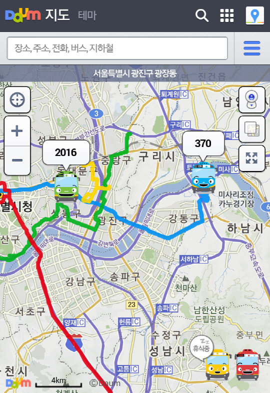 선풍적인 인기에 힘입어 타요버스 운행 지역이 성남시와 순천시까지 확대됐다. 광주광역시도 3일부터 타요버스를 운행할 계획이다. 다음 지도 역시 이들 지역에서의 실시간 타요버스 위치 정보를 알려준다. PC와 모바일 다음 지도 검색창에서 '성남', '순천', '광주' 등 각 지역명과 함께 타요버스를 검색하면 해당 지역의 타요버스 현재 위치를 확인할 수 있다. 어린이날에는 서울시 20대, 성남시 4대, 순천시 4대, 광주광역시 2대까지 총 30대의 타요버스 위치 정보를 볼 수 있다. 어린이날을 맞아 자녀에게 특별한 체험을 선사하고 싶다면 인근 지역의 타요버스 위치를 다음 지도에서 미리 확인해두는 것이 편리하다. 특히 서울시의 타요버스는 공식적으로 5일, 어린이날까지만 운행하므로 탑승을 계획하고 있다면 서두르는 편이 좋다.