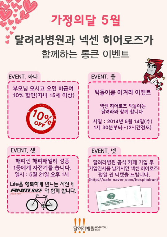 가정의 달 5월을 맞이하여 달려라병원은 프로야구단 넥센 히어로즈와 함께하는 다양하고 통 큰 이벤트를 실시한다.