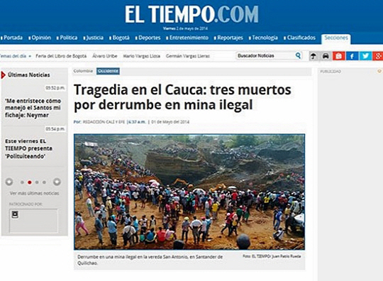 1일(현지시각) 콜롬비아 현지 매체 엘 티엠포는 지난달 30일 콜로비아 서남부 카우카 지방의 미허가 금광에서 지반이 붕괴하는 사고가 일어나 3명이 사망하고 최소 30명이 매몰됐다고 전했다.