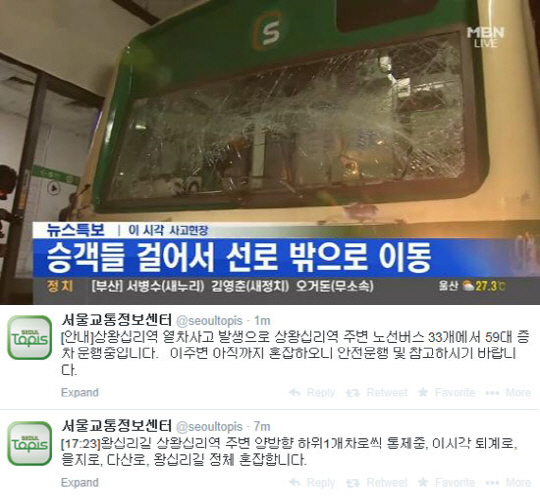 2일 서울교통정보센터 트위터에는 "상왕십리역 열차사고 발생으로 상왕십리역 주변 노선버스 33개에서 59대 증차 운행 중입니다. 이 주변 아직까지 혼잡하오니 안전운행 및 참고하시기 바랍니다"라는 안내가 고지됐다.