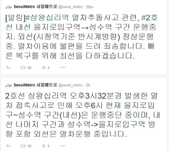 앞서 이날 오후 3시32분쯤 지하철 2호선 상왕십리역에서 성수역 방면으로 향하던 전동차 2대가 추돌하는 사고가 발생했다.