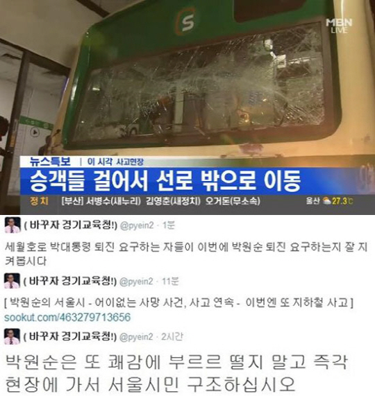 2일 변희재 대표는 자신의 트위터에 "박원순은 또 쾌감에 부르르 떨지 말고 즉각 현장에 가서 서울시민 구조하십시오"라며, 인터넷커뮤니티 수컷닷컴에 게재된 "박원순의 서울시-어이없는 사망 사건, 사고 연속-이번엔 또 지하철 사고"라는 글을 링크하며 박원순 시장을 조롱했다.