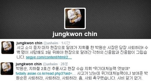 2일 진중권은 자신의 트위터에 기사 링크를 첨부하며 "사고 소식 듣자마자 현장으로 달려가 지휘를 한 박원순 시장은 당장 사퇴하라! 수 백 명이 사망해도 3일 뒤에야 현장으로 달려간 각하의 신중함과 진중함이 그립습니다"라는 글을 게재했다.
