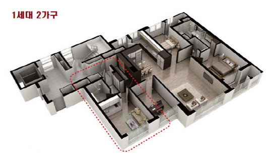 부분임대형 아파트는 기존 아파트와 달리 두 가구가 독립적으로 생활할 수 있는 구조다. 1주택으로 분류돼 임대소득과세에서도 자유롭고 두 가구가 각자 현관을 갖추고 있어 사생활이 보호된다. 세입자는 커뮤니티 시설과 높은 보안성 등 아파트의 장점을 누릴 수 있어 선호가 높으며 주변 오피스텔이나 원룸보다 시세가 높게 형성돼 있다.