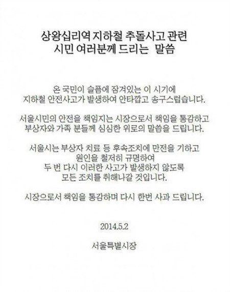 박원순 시장은 "온 국민이 슬픔에 잠겨있는 이시기에 지하철 안전사고가 발생하여 안타깝고 송구스럽다"며 "서울시민의 안전을 책임지는 시장으로서 책임을 통감하고 부상자와 가족 분들께 심심한 위로의 말씀을 드린다"고 사과의 말을 전했다.