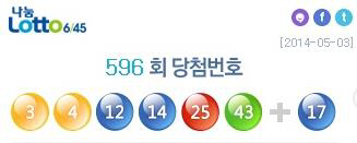 3일 나눔로또 제596회 추첨 결과 1등 당첨번호는 '14, 43, 12, 25, 3, 4'이며, 2등 보너스 번호는 '17'로 결정됐다.